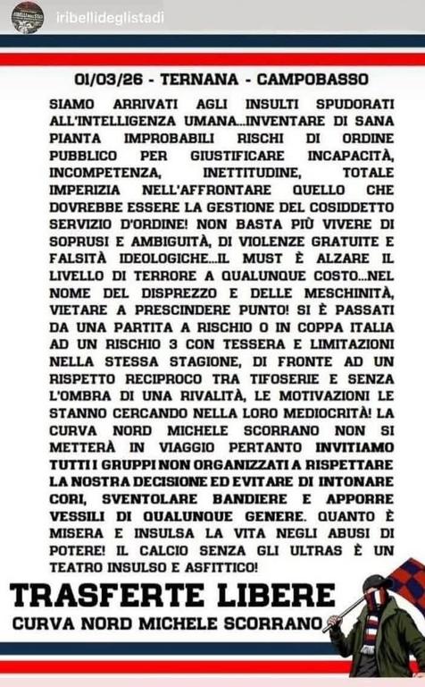 Data: 4/3/2026 ore 12:33 Dopo la vendita libera che ha fatto registrare 1.500 biglietti venduti ai Tifosi del Catania, oggi (un giorno prima della partita) arriva il divieto di trasferta ai residenti in Sicilia per il rischio di incroci tra tifoserie in movimento nello stesso giorno tra Catanesi diretti a Benevento e Cavesi diretti a Crotone. La trasferta sarà vietata anche ai Tifosi della Cavese. |